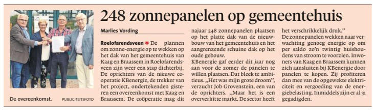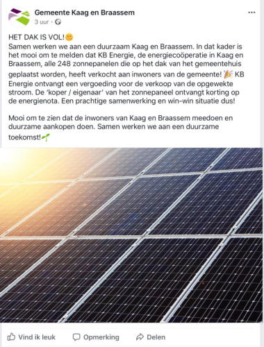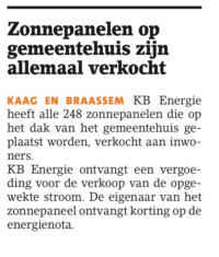 24 september 2018. De definitieve inschrijving voor het project Zonnepanelen op het gemeentehuis Kaag en Braassem is geopend.